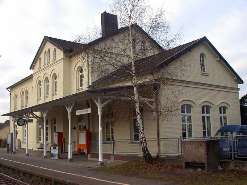 Das denkmalgeschützte Empfangsgebäude wurde umfangreich für die neuen Nutzungen Gastronomie, Kiosk/ Kundenzentrum, Büros sowie Wohnungen umgebaut. Nicht dem Ursprungsbestand entsprechende Anbauten und sonstige baulichen Veränderungen wurden „zurückgebaut“, die gesamte Aussenhülle saniert sowie der Innenausbau komplett modernisiert. Auftraggeber: Gemeinde Weilerswist. (2005)