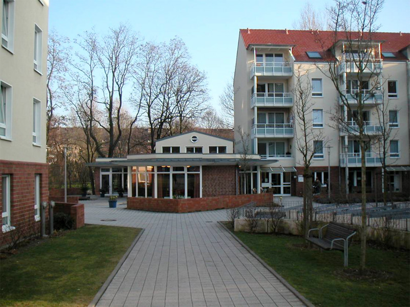 In Konzept und Ausführung zukunftsweisende Wohnanlage, bei der durch Integration von 75 altenfreundlichen Wohnungen für 1- und 2-Personen-Haushalte eine Wohnbebauung mit insgesamt 117 WE „Wohnen mit Service und Nachbarschaft“ konsequent in die Praxis umgesetzt werden konnte. Im Mittelpunkt der räumlich aufeinander ausgerichteten Baukörper befindet sich ein durch die Diakonie betreutes Begegnungszentrum mit angegliedertem Wohlfühlcenter. Fertigstellung in 1999.