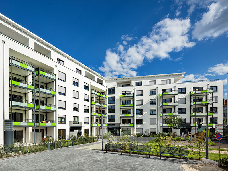 Alle Wohnungen verfügen über zum ruhigen Innenhof orientierte Lärmschutzgrundrisse mit Balkonen, Mietergärten oder Dachterrassen. Energiestandard: KfW-Effizienzhaus 70, zentrale Lüftungsanlagen mit Wärmerückgewinnung.